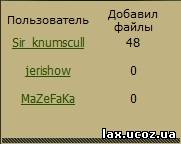 <table style="text-align: center;border-collapse: collapse; width: 100%; "><tbody><tr><td>Пользователь</td><td>Добавил файлы</td></tr><tr><td><span style="font-family: Tahoma, Verdana, Arial; font-size: 12px; text-align: -webkit-right; white-space: nowrap; ">$MYINF_2$</span>